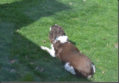 This big dog just sat and watched the geese; Holly barks and barks and barks (although we did buy a cheap bark collar that works about as well as a cheap bark collar should I guess). The geese have nothing to fear from the invisibly-fenced springer spaniels. That big orange cat might cause some issues though.