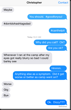 This series of texts occurred during that same lineman camp…..Cpher ended up getting a hold of Mom and talking through it. We still aren’t sure what was going on; didn’t eat right in the morning, ate something funny…who knows. But he did sound like he almost fainted doing the wind sprints at the end of the day…